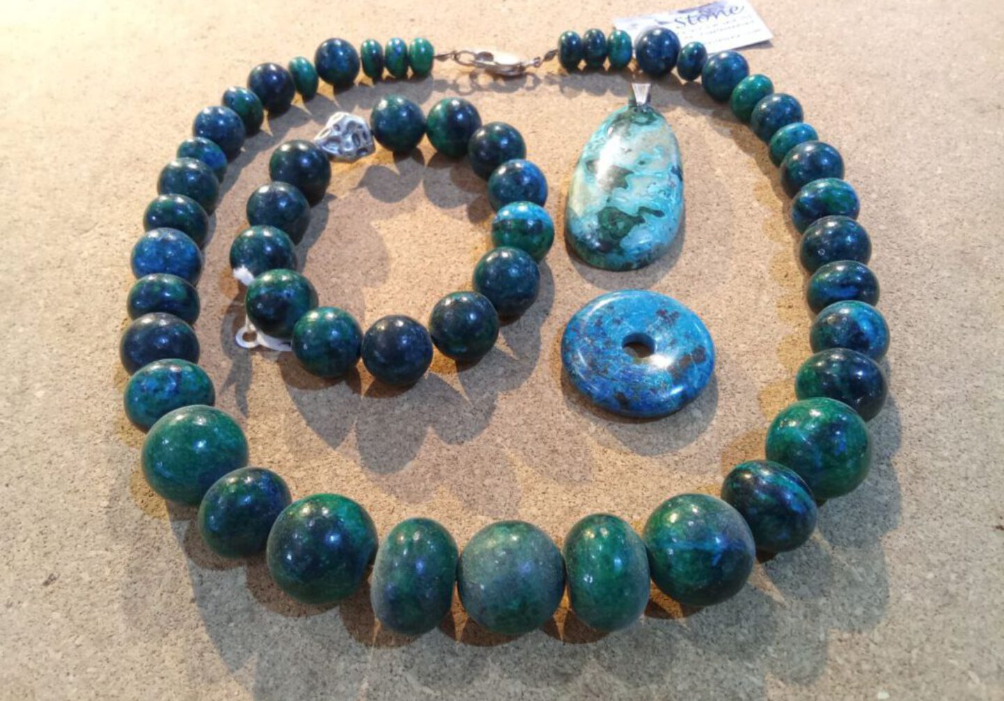 Chrysokoll-Schmuck in leuchtendem Blaugrün – Kette, Anhänger und Donut aus der Oxidationszone peruanischer Kupferlagerstätten