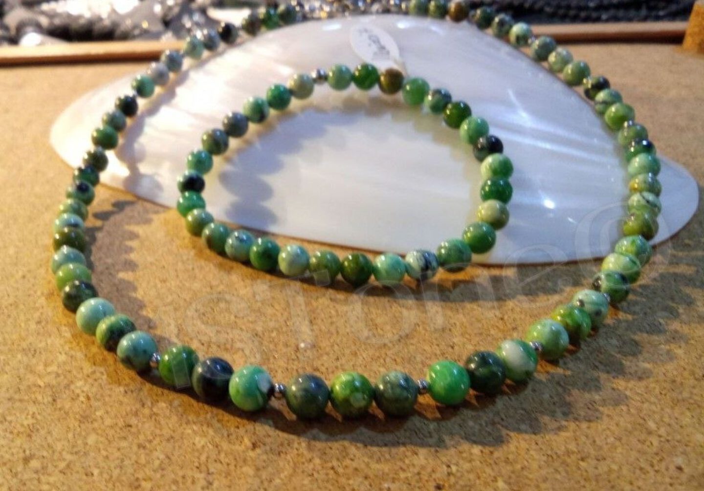 Edelstein-Kugeln und Kugelketten: Polierte Edelstein-Kugeln als Ketten und Armbänder; das frische Apfelgrün als Kette lebendig und aufmunternd